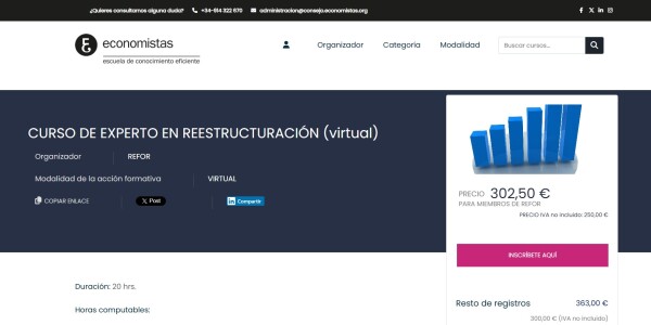 Para cumplir con el requisito de formación de 20 horas en esta materia el Consejo General ha elaborado un curso que está disponible en el siguiente webinar grabado, al que puede acceder a través del siguiente enlace: https://formacion.economistas.es/cursoinfor.php?idCursoMasInfo=1105