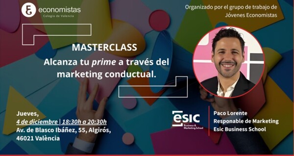 El grupo de trabajo de Jóvenes Economistas del COEV ha organizado un encuentro en el que se ofrecerá la masterclass: ‘Alcanza tu prime a través del marketing conductual’, a cargo del responsable de marketing de ESIC, Paco Lorente.