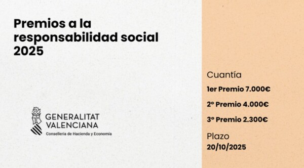 La Secretaría Autonómica de Economía, a través de la Dirección General de Economía, convoca la jornada de presentación de los Premios a la Responsabilidad Social 2025. El acto se celebrará el 7 de octubre a las 12:00 en el Salón de Actos de la Conselleria de Hacienda y Economía, en la calle Palau 14 de València.