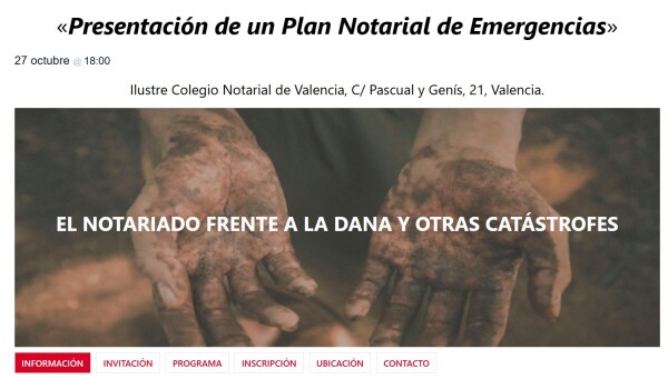 El Ilustre Colegio Notarial de Valencia acogerá el lunes 27 de octubre, a las 18h, un acto que bajo el título "El notariado frente a la Dana y otras catástrofes", presentará el Plan Notarial de Emergencias y recordará en unas mesas redondas, junto a otros colegios profesionales, la actuación ofrecida a los afectados por la DANA de octubre de 2024.
