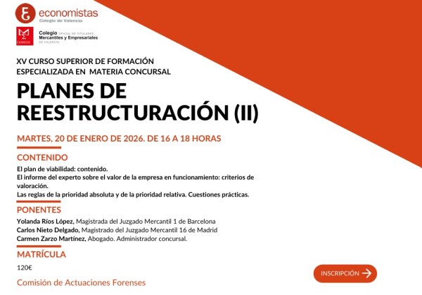 El martes 20 de enero tendrá lugar la segunda de las ocho sesiones del XV Curso superior de formación especializada en materia concursal. El contenido de esta sesión será el plan de viabilidad, el informe del experto sobre el valor de la empresa en funcionamiento y las reglas de prioridad absoluta y la prioridad relativa.