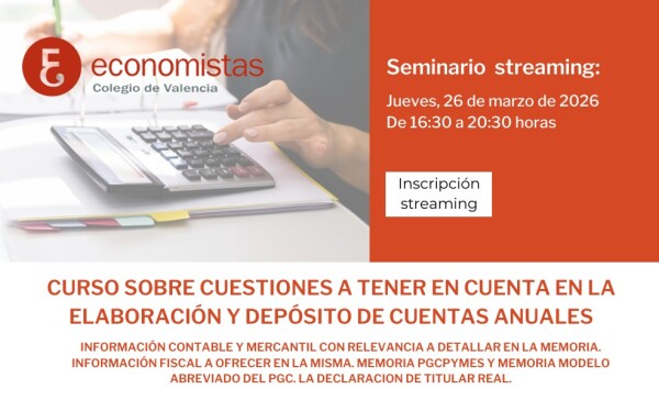 La Comisión de Fiscal ha organizado un curso online sobre las cuestiones a tener en cuenta en la elaboración y depósito de cuentas anuales. Será el 26 de marzo de 16.30 a 20.30 horas, a cargo de Antonio Martínez Alfonso, Doctor en Ciencias Económicas y Empresariales. Técnico de la AEAT en la Dependencia Regional de Inspección de Valencia.