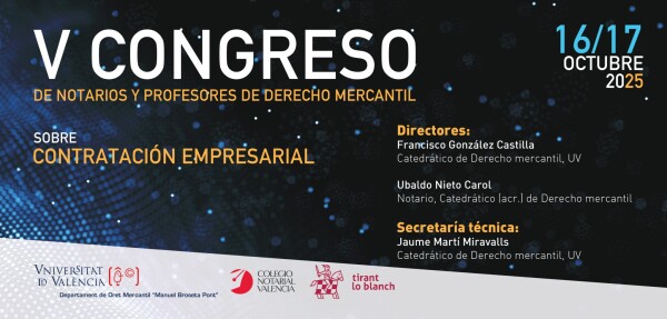 El Colegio Notarial de Valencia y el Departamento de Derecho Mercantil "Profesor Manuel Broseta Pont" de la Facultad de Derecho de la Universitat de València (UV) organizan el V Congreso de Notarios y Profesores de Derecho Mercantil sobre Contratación Empresarial, los días 16 y 17 de octubre.