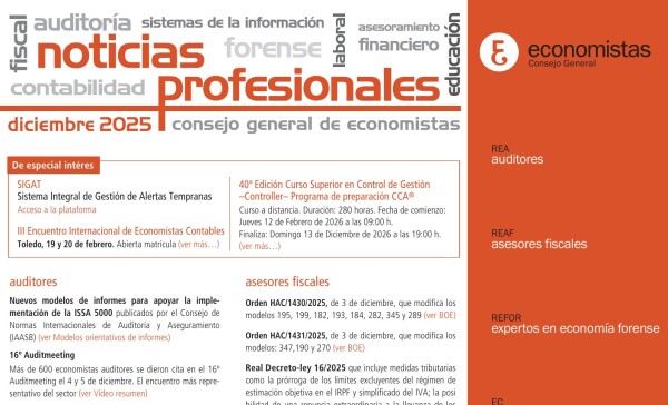El Consejo General de Economistas ha remitido a los colegiados el nuevo número de ‘Noticias Profesionales’, correspondiente al mes de diciembre. El documento recoge información de interés para auditores, asesores fiscales, financieros y laborales, contables, economistas forenses o docentes e investigadores, y demás profesionales.